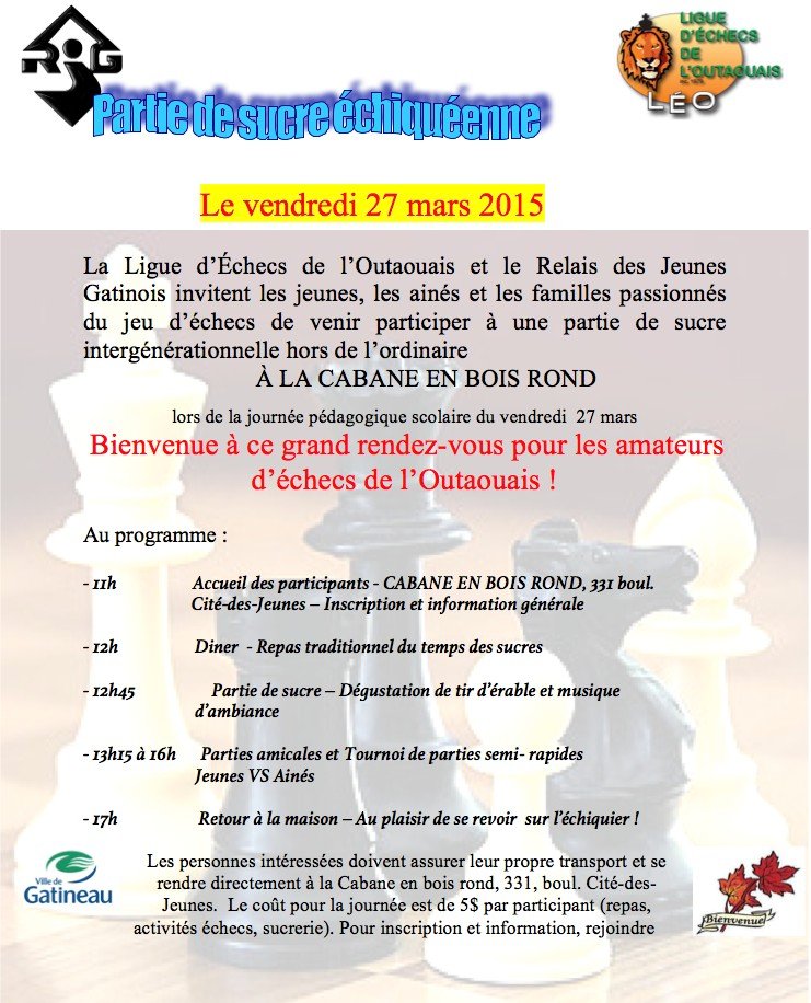 Par chèque ou mandat à l’ordre de : Ligue d’échecs de l’Outaouais 491, rue Saint-Luc, Gatineau (Québec), J8P 3G3