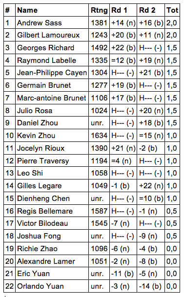 Deux rondes de complétées au tournoi Hiver CEA 1 du club d’échecs d’Aylmer. Andrew Sass et Gilbert Lamoureux sont seuls en tête avec leurs 2 points.