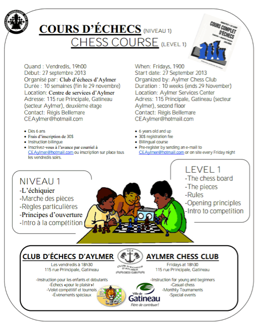 Le club d’échecs d’Aylmer offrira un cours pour les débutants (niveau 1 et 2) qui commencera ce vendredi 10 janvier 2014. L’intention de ce cours est de préparer les jeunes en vue du Championnat Jeunesse de l’Outaouais qui aura lieu à Aylmer le 9 mars prochain. Le cours aura une partie théorique (18h30-19h00) et une partie pratique (19h00-20h00) sous la forme de parties cotés FQE. Chaque semaine, les jeunes seront familiarisés à quelques concepts clés tel que les notions d’ouvertures, la tactique et les finales élémentaires. Ils recevront des exercices à compléter à la maison. Il est à noter que les étudiants qui n’ont pas complété la théorie du niveau 1 pourront le faire grâce à une approche modulaire personnalisée.