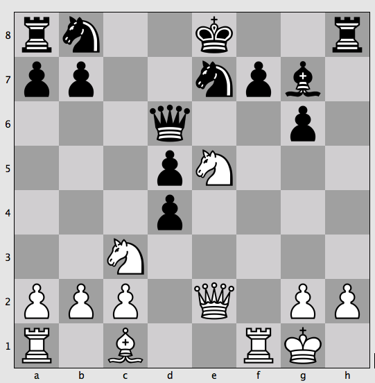 Luc a joué 14.Ff4. Sébastien a accepté le challenge en prenant le Cavalier en c3. Résultat ? Un Roi noir qui se retrouve pourchassé au centre de l’échiquier !