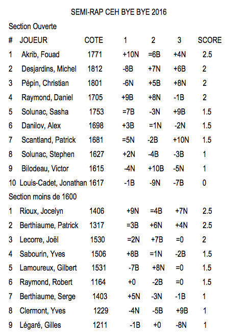 La fin de parcours de ce dernier tournoi 2016 nous réserve d’autres belles parties chaudement disputées. Le fougueux attaquant Fouad Akrib stoppe l’élan victorieux de Daniel Raymond ce qui lui permet de finir premier avec 2.5 points. Il devance Michel Desjardins, Christian Pépin et Daniel Raymond qui terminent un demi-point derrière lui en deuxième place. À souligner, l’enlevante partie remportée par Patrick Scantland contre Jonathan Louis-Cadet. Malgré l’avantage décisif de Jonathan, Patrick a réussi à mystifier son adversaire et, profitant de sa cruelle pression de temps et sous le regard attentif de plusieurs éberlués spectateurs, a réussi une inattendue victoire en damant un pion longtemps perdu tout en évitant à plusieurs reprises d’imparables mats.