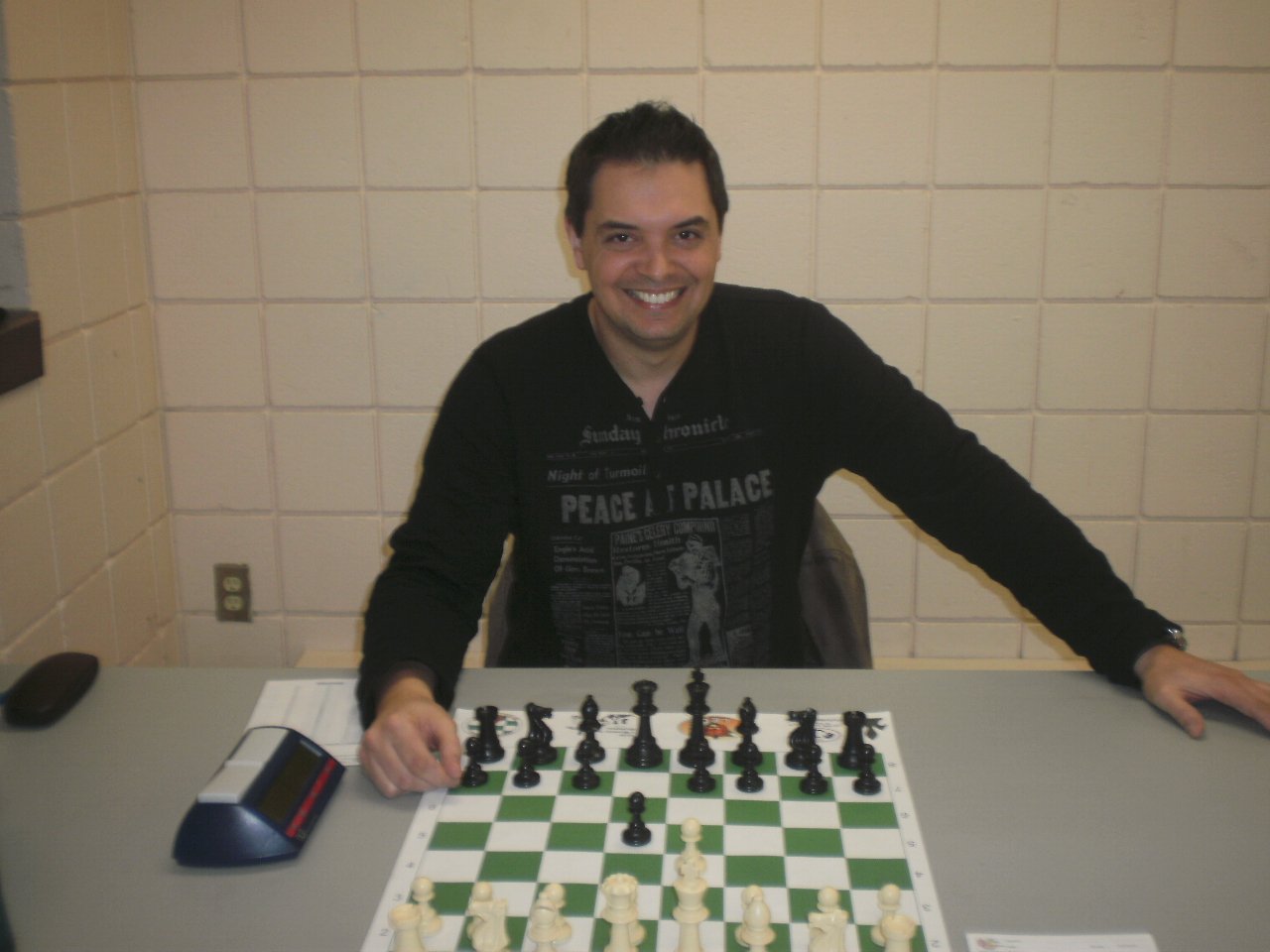 Nous avons donc droit à tout un finish! Du côté des Blancs, Michel Desjardins n’a besoin que d’une partie nulle pour remporter le tournoi alors que Gilles Groleau se doit de le vaincre avec les Noirs. Gilles choisit une embêtante Défense Sicilienne Fermée, joue agressivement, complique le jeu et tente le tout pour le tout. Rien à faire, Michel déjoue tous les tours de passe-passe, égalise la position à tout coup, résiste à son adversaire adroitement et va chercher son demi-point manquant