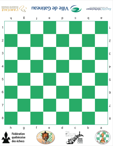 Durant les années 80, la Ligue d’Échecs de l’Outaouais a fait imprimer des échiquiers LEO en papier. À cette époque, nous avions comme commanditaire la Brasserie O’Keefe et c’est ainsi que les échiquiers Carlsberg apparaissaient dans les clubs d’échecs de la région. Il était temps d’en faire de nouveaux et mon graphiste, Monsieur Jacques de Bellefeuille a fait un travail de qualité et nous les avons eu juste à temps pour la simultanée de Short. Vis-à-vis les pièces blanches apparaissent les logos de nos partenaires: Société Alzheimer de l’Outaouais Québécois, la Ville de Gatineau, Service des Loisirs, des Sports et du Développement des Communautés et l’Amicale des Personnes Handicapées Physiques de l’Outaouais. Vis-à-vis les pièces noires apparaissent les logos de la Fédération Québécoise des Échecs, de la Ligue d’Échecs de l’Outaouais, du Club d’Échecs de Gatineau et du Cercle d’Échecs de Hull.