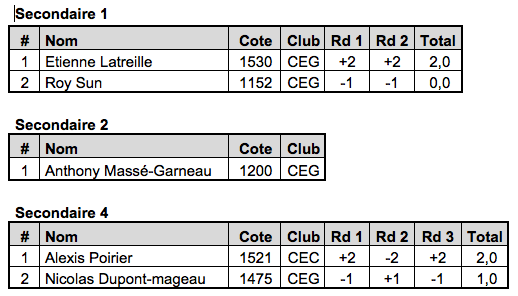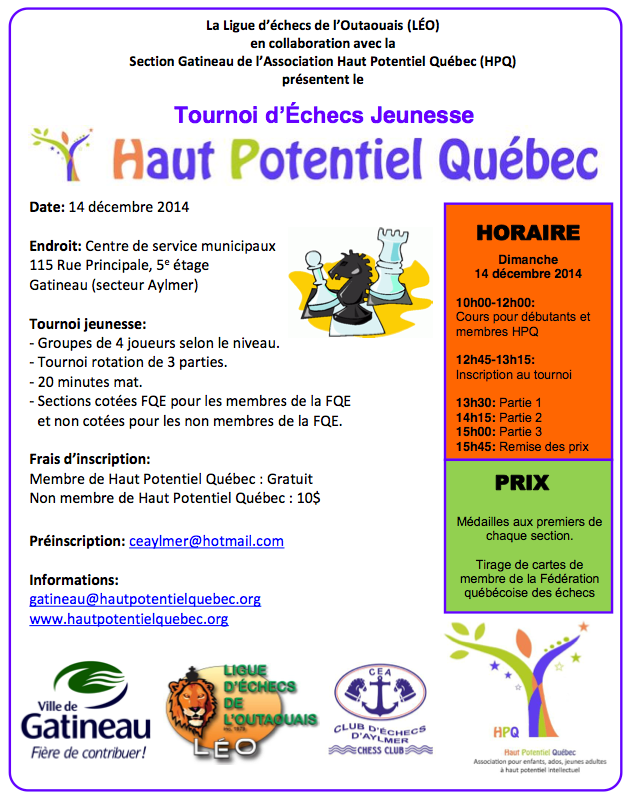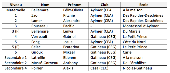 Félicitations à nos jeunes champions par niveau scolaire de l’Outaouais qui se sont qualifiés pour participer au Défi Échiquéen du Québec 2015 qui aura lieu à Montréal le 26 avril prochain . La qualification s’est tenue au Club d’échecs d’Aylmer du 6 au 8 février avec un total de 26 joueurs. Le club d’échecs d’Aylmer remercie la ville de Gatineau pour le soutien.