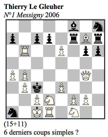Bien sûr plus on va remonter loin dans la partie, plus la difficulté sera croissante, en tout cas pour les problèmes où les derniers coups sont déterminés, mais aussi pour les partie justificatives que nous aborderons plus tard. Pourtant il est possible d’être obligé d’investiguer jusqu’à la position initiale de la partie pour aller y chercher des éléments beaucoup plus triviaux permettant une déduction sur la position du diagramme.