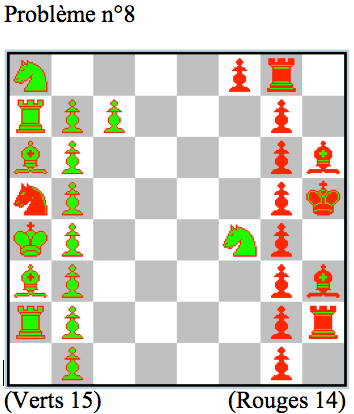 Ici les pièces n’ont pas revêtu leur couleur et c’est au solutionniste de trouver lesquelles sont noires et lesquelles sont blanches. Il faut bien sûr que la position obtenue soit légale après coloriage, c’est-à-dire qu’il existe au moins un déroulement de partie respectant les règles des échecs conduisant à la position du diagramme.