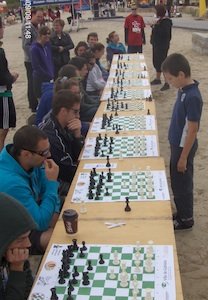 Autour de 13 h se pointe un jeune joueur-vedette LÉO et je lui offre la chance d’affronter en simultanée dix joueurs à la fois. Notre petit maître de dix ans, Étienne Latreille relève le défi et fort de son expérience d’il y a quelques jours à peine, lors de la simultanée du MI québécois Jean Hébert, se met à l’oeuvre et affronte dix étudiants universitaires. Les spectateurs se multiplient et les gens prennent de nombreuses photos et filment notre cadet-émule de Jean Hébert. Le DJ interrompt même la tonitruante musique pour quelques minutes afin d’inviter les gens à venir voir notre phénomène en action. Ce fut le moment fort de la journée et un vrai attroupement de plusieurs dizaines de personnes curieuses sont venues constater le résultat des parties. Notre petite machine à coucher des Rois fonctionnait à plein régime et le petit Latreille en à peine deux heures remporta les 30 parties qu’il a jouées. Les gens étaient abasourdis, souriants et heureux pour notre jeune prodige ! Ses adversaires aussi étaient contents d’avoir affronté notre petit Turc québécois. Des gens l’ont félicité en lui serrant la main, certains voulaient même son autographe. On peut dire qu’il a volé la vedette de l’après-midi.Les organisateurs étaient très satisfaits de cette journée de rêve pour le festival, nous ont remerciés de notre présence et nous comptons bien d’être de retour l’an prochain. Une occasion unique de se faire connaître dans un environnement familial et festif ! C’est du bonheur de rencontrer des gens attachants et intéressants !
