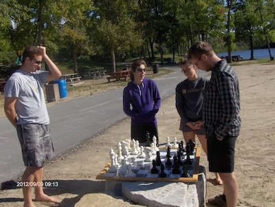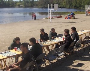 Le président de la LÉO aménageait tôt le matin ses pénates sur la belle plage sablonneuse du magnifique Lac Beauchamp. Dix jeux prêts à accueillir des festivaliers en quête de divertissements intéressants et différents de ce que l’on retrouve habituellement dans les festivals. Notre jeu géant est l’attraction principale en début de journée. Nous avions la chance d’avoir comme voisin le kiosque du département de la faculté de génie de l’Université de Sherbrooke. Ces futurs ingénieurs venaient participer aux courses prévues en après-midi et étaient très contents de pouvoir jouer aux échecs et ils se sont installés à leur grand bonheur devant les échiquiers pendant de longues heures.