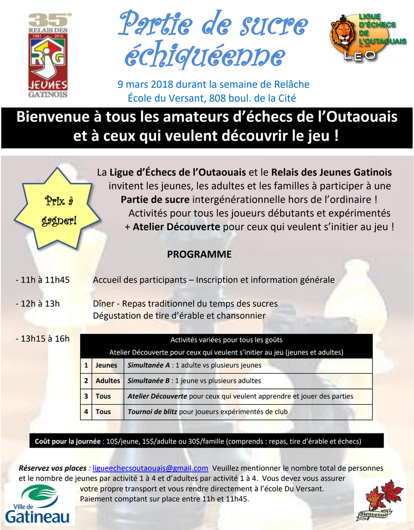 Frais d’inscription : 10$/jeune, 15$/adulte ou 30$/famille. Paiement comptant sur place entre 11h et 11h45. Les places sont limitées et nous vous demandons de réserver vos places en écrivant à : ligueechecsoutaouais@gmail.com. Veuillez mentionner le nombre de personnes et le nombre de jeunes pour les activités 1, 3 et 4 et le nombre d’adultes pour les activités 2 à 4.