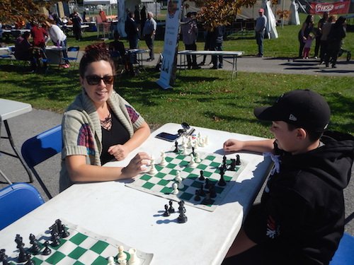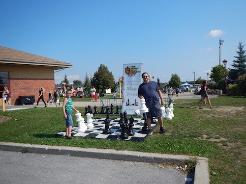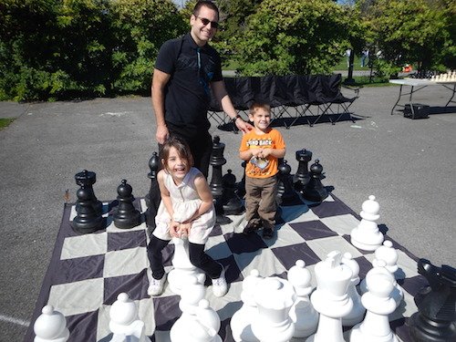 Dès mon arrivée à 10h00, second coup de chance, l’unique stationnement libre du vaste parking et, par surcroît, situé le plus à proximité de notre aire réservée aux échecs, m’attend. Ça commence bien la journée ! Valori Éthier me rejoint quelques vingt minutes plus tard ayant cherché longuement un emplacement pour garer son véhicule dans le voisinage. Heureusement, les pièces et échiquiers standards qui appartiennent au RJG sont déjà installés, ce qui nous sauvent beaucoup de temps préparatoire. Il ne nous reste plus qu’à installer les trois jeux grands formats, plus les pièces géantes, toujours visiblement attirantes.