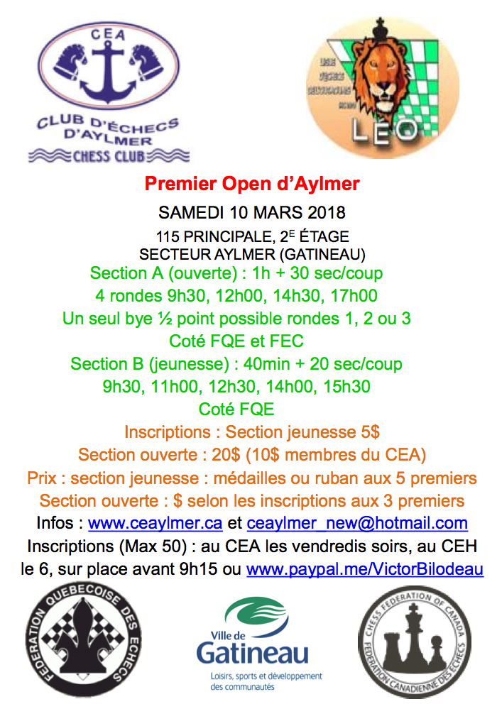 Nous venions de recevoir la veille plus de 600 calendriers 2017-2018 de la LÉO et avons profité, en attendant l’arrivée du public, de plier quelques centaines de ces dépliants afin de pouvoir les remettre à nos attendus amateurs échéphiles. Ils apprendraient ainsi que leur club du coin, soit le Club d’Échecs de Gatineau déménageait au Centre communautaire St-Jean-Brébeuf à la fin du mois, après dix mois d’inactivité. Nous tenons à remercier notre important commanditaire, le Relais, pour sa continuelle et annuelle contribution à l’impression de notre calendrier.