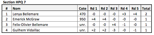 Heureusement, la section ouverte est toujours d’un bon calibre et on y retrouve presque toujours le GMI champion canadien Bator Sambuev et plusieurs Maîtres Nationaux et Experts. Quelle surprise d’y voir un tout petit enfant jouer dans cette redoutable section! Encore plus surprenant, le voir tirer son épingle du jeu de façon incroyable! Lors de ces deux tournois, il est demeuré invincible en dix parties, combinant 2 victoires et 3 parties nulles en septembre pour une cote performance de 2355 et 3 victoires et 2 parties nulles en novembre pour une seconde norme, cote performance de 2452. Il s’est même permis d’annuler sa partie contre le GMI Sambuev et de gagner celle contre la MFF Championne du monde des moins de 14 ans Qiyu Zhou!