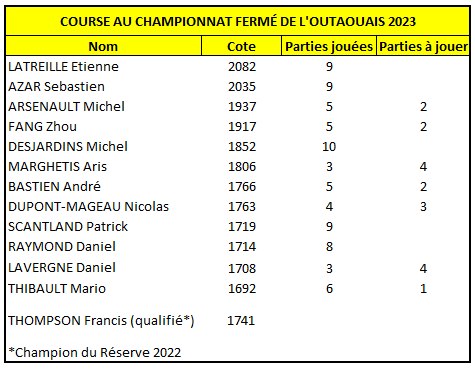 Pour se qualifier, il faut avoir joué au moins 7 parties lentes dans les clubs de la région. L’invitation se fait ensuite selon la cote. Comme une place est réservée pour Francis Thompson, le champion 2022 du tournoi Réserve, il y a donc 7 postes à pourvoir. Comme on peut voir dans notre classement, la lutte est présentement très serrée et tout est encore possible. Le dernier tournoi pour se qualifier au CEH sera le Alekhine du 17 janvier au 28 février. 7 rondes sont prévues.