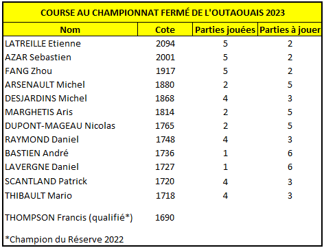 Pour se qualifier, il faut avoir joué au moins 7 parties lentes dans les clubs de la région. L’invitation se fait ensuite selon la cote. Comme une place est réservée pour Francis Thompson, le champion 2022 du tournoi Réserve, il y a donc 7 postes à pourvoir. Comme on peut voir dans notre classement, la lutte est présentement très serrée et tout est encore possible. Avec le Ruy Lopez et l’Alekhine à partir de janvier, un total de 14 parties sont offertes pour se qualifier.