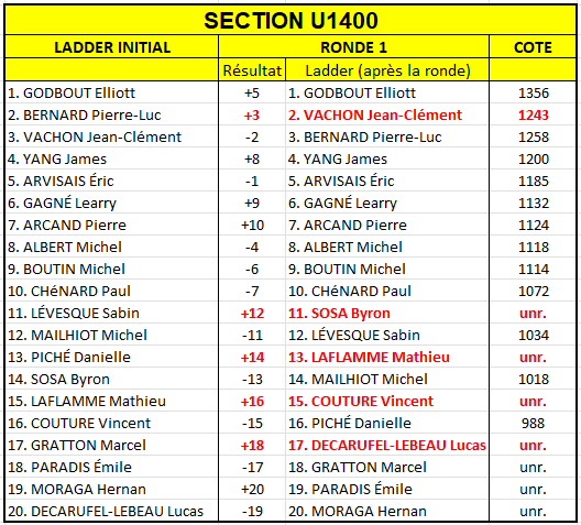 Comme le Mémorial Luc Bourbonnais, nous utilisons la formule Ladder pour ce tournoi, ce qui permet d’avoir plus de parties équilibrées. À noter cette semaine dans l’Ouverte, les victoires de Francis Thompson sur Mario Thibault et du nouveau venu Christian Scrieciu sur Vincent Hamon. Dans le U1400, se sont démarqués Jean-Clément Vachon, Byron Sosa, Mathieu Laflamme, Vincent Couture et Lucas Decarufel-Lebeau.