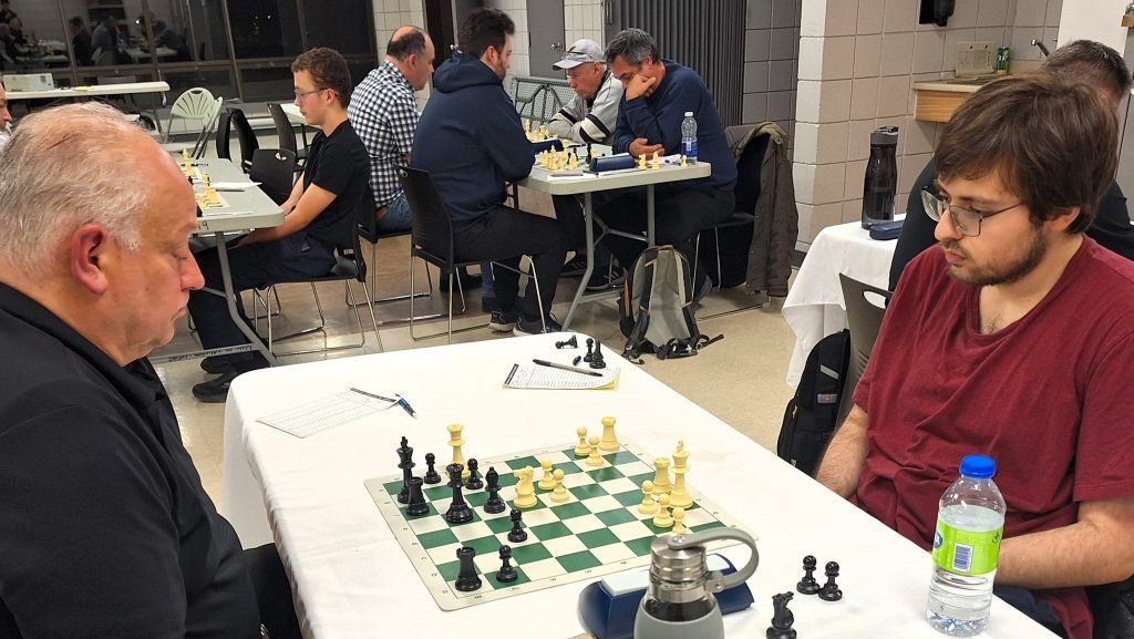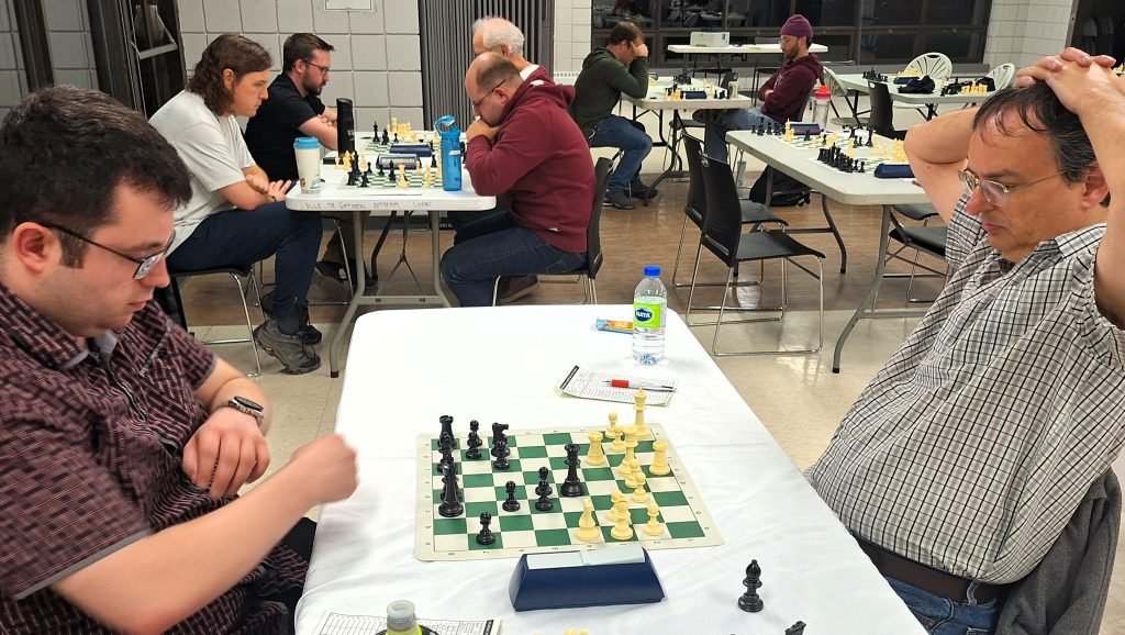 Nicolas Dupont-Mageau vs Daniel Raymond : un duel de Titans avait lieu entre Nicolas et Daniel. J’ai remarqué qu’il y a souvent beaucoup d’échanges rapides entre ces 2 joueurs et cette partie n’a pas fait exception alors que les 2 joueurs se sont retrouvés dans une finale 2 tours + cavalier + pions contre 2 tours + fou + pions en moins de 20 coups. J’ai été bien impressionné par le 17…Td5! de Daniel ou encore le très beau 22.d4! de Nicolas.