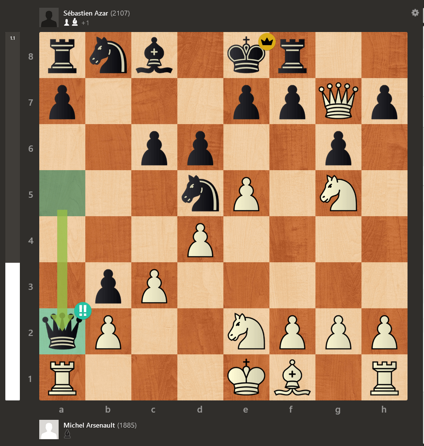 Michel Arsenault vs Sébastien Azar : Michel a joué toute qu’une surprise à Sébastien puisqu’il a laissé de côté sa fidèle anglaise pour jouer 1.d4. Je ne suis pas certain si notre expert voulait jouer la Jobava attaque, le système de Londres ou une autre ouverture similaire, mais la partie est devenue une Pirc en raison des coups des 2 opposants. Michel a très bien joué l’ouverture et il avait même un gros avantage et une initiative particulièrement dangereuse. Comme d’habitude, Sébastien a sorti un lapin de son chapeau et je vous invite à regarder le dernier coup du match :