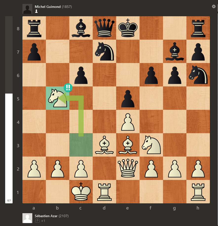 Sébastien Azar vs Michel Guimond : pour surprendre le Maître, Michel a adopté la défense moderne plutôt que sa fidèle française. Sébastien a répondu par la variante Suttles qui m’était inconnue. Comme d’habitude, Sébastien était en grande forme et il a joué un coup superbe au 11e coup :