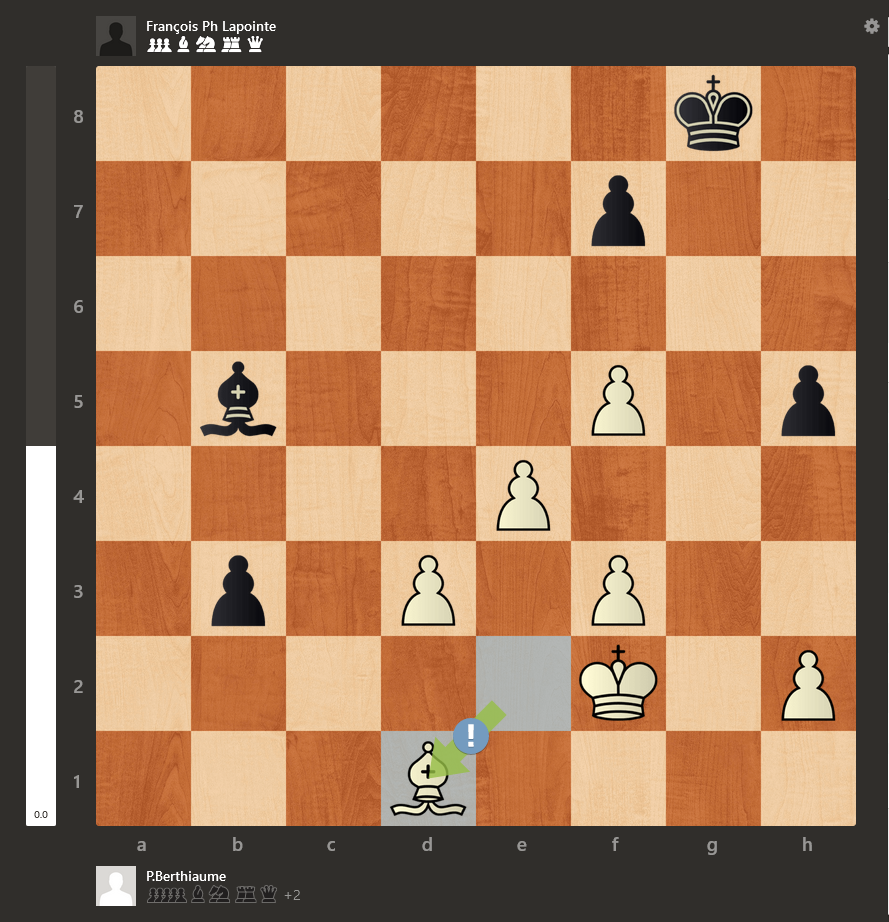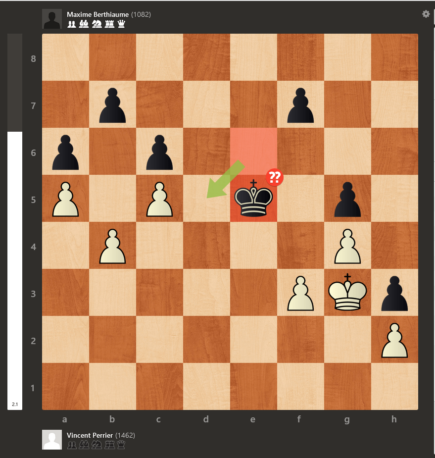 Il y a eu plusieurs coups imprécis en milieu de partie, de sorte qu’on s’est retrouvé dans une finale de tour complètement nulle. Le problème pour Maxime, c’est qu’il a échangé sa tour pour la tour adverse et la finale de pions était très difficile à jouer. Je pense qu’il aurait pu annuler sans trop de problème s’il avait gardé les tours en jeu. Pour tenir la finale de pion, il aurait fallu que Maxime joue cette variante très difficile alors que votre humble serviteur aurait probablement échoué aussi :