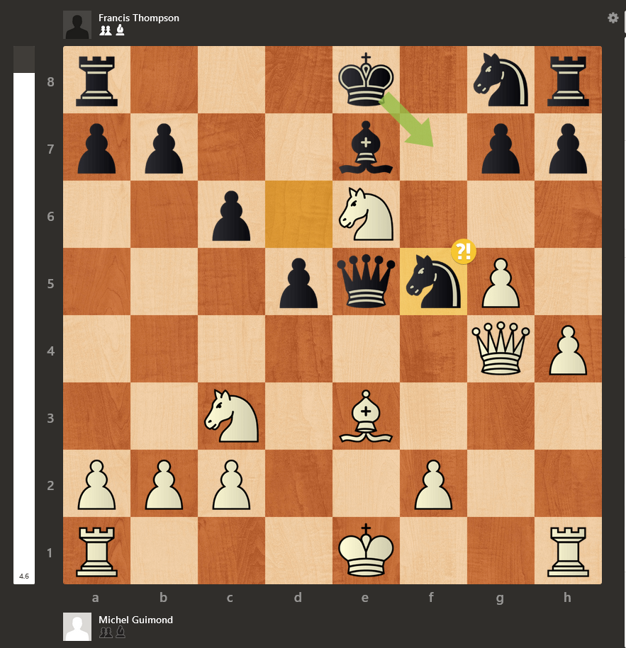 Michel Guimond vs Francis Thompson : vous savez, Francis n’a pas mal joué, mais c’est plutôt Michel qui a été splendide dans cette partie! C’est vrai que Francis a probablement regretté de ne pas avoir joué 12…Fd6! Plutôt que Dd6? Cela dit, Michel a joué agressivement en mettant beaucoup de pression sur son adversaire et il a gagné par le biais d’une jolie tactique :
