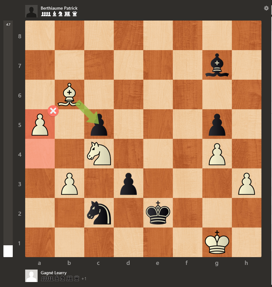 Learry Gagné vs Patrick Berthiaume : les 2 adversaires ont joué une partie très excitante puisque chacun d’entre eux aurait pu remporter le match. Learry aurait pu gagner un 2e pion s’il avait joué 32.Cc7+! Rf5 33.Cxd5 ou au 35e coup après tout simplement 35.Cxd5. Par la suite, le pion « d » de Patrick est devenu vraiment dangereux. Je me souviens de lui avoir dit après le match que sa finale était probablement gagnante à un moment donné et je n’avais pas tort :