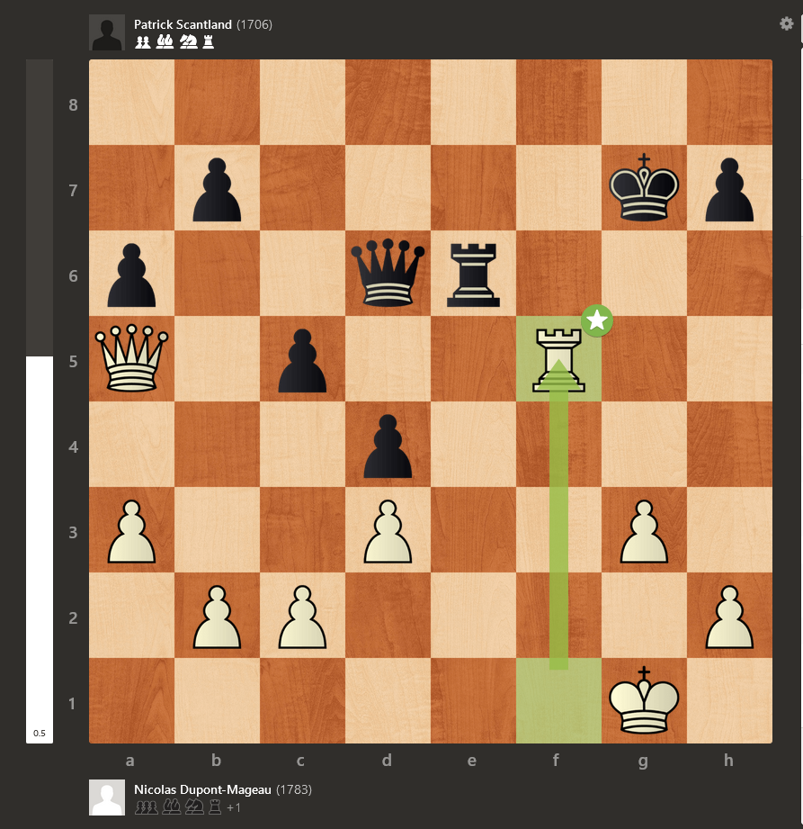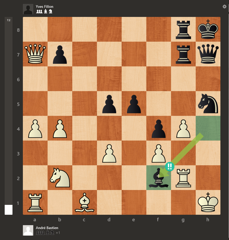 33…Ff2!! C’est très rare que j’utilise le double point d’exclamation, mais c’est amplement mérité ici. André a tenté 34.Th2, mais a abandonné après 34…Fxa7. Quelle attaque du patriarche Filion!