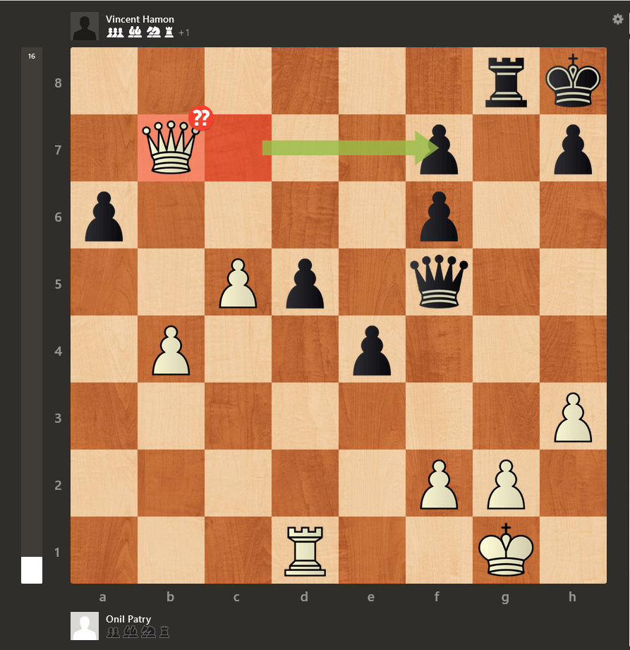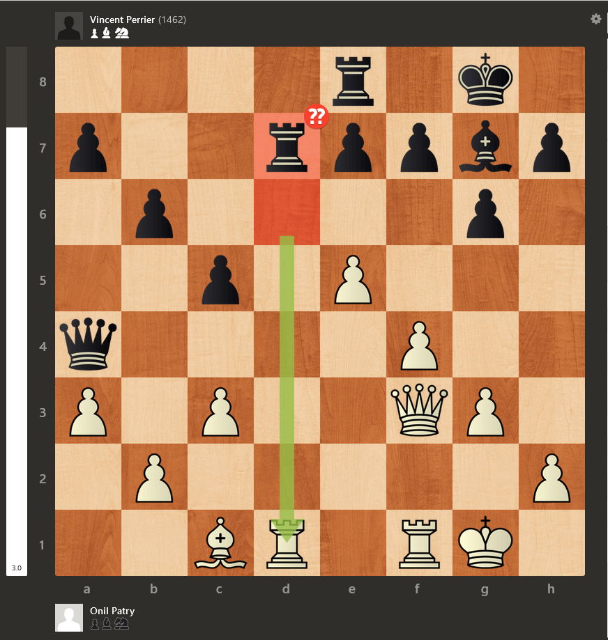 Onil aurait pu jouer l’excellent 23.b3! et la tour noire en d7 serait tombée au combat. En effet, après 23.b3! Db5 24.c4! et la dame ne peut plus protéger sa tour. Étrangement, c’est Onil qui a donné une tour quelques coups plus tard et ça a été un jeu d’enfant pour Vincent de terminer la partie. Très belle partie de sa part!