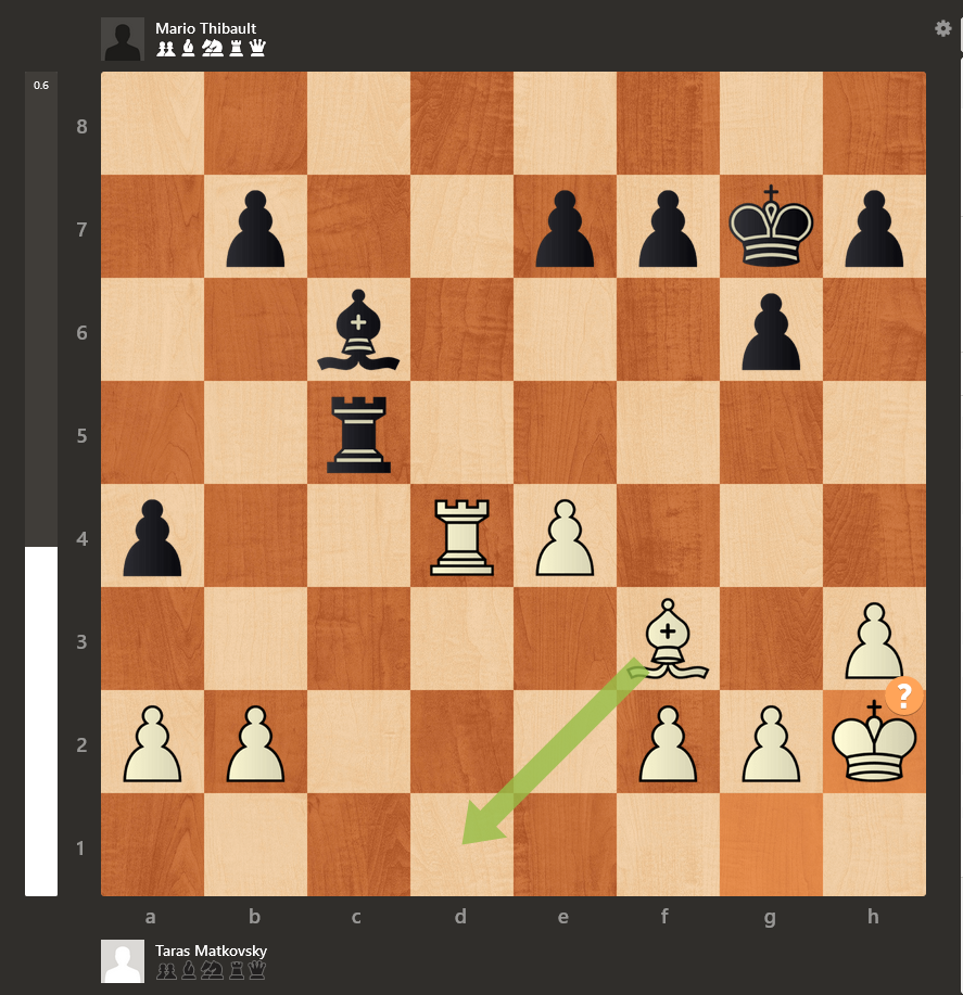 Quand j’ai vu le fautif 26.Rh2? j’étais pas mal convaincu que Mario jouerait le très fort 26…Tc2! qui aurait permis à celui-ci de gagner au moins un pion, les pions b2 et f2 étant attaqués. Malheureusement pour Mario, Taras a été pratiquement parfait en finale et il l’a emporté avec un pourcentage de précision de 90,9%. Quelle partie de Taras!