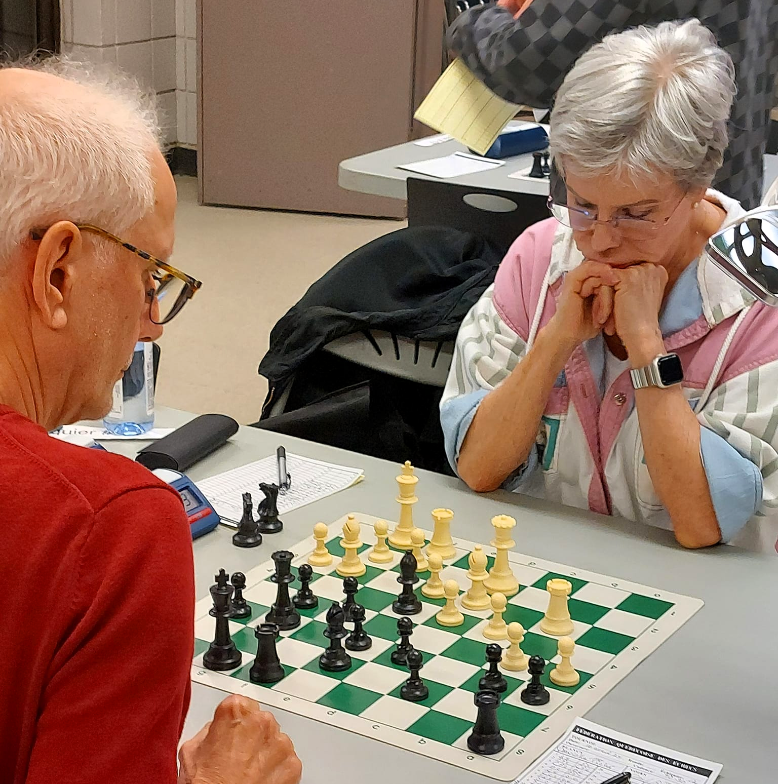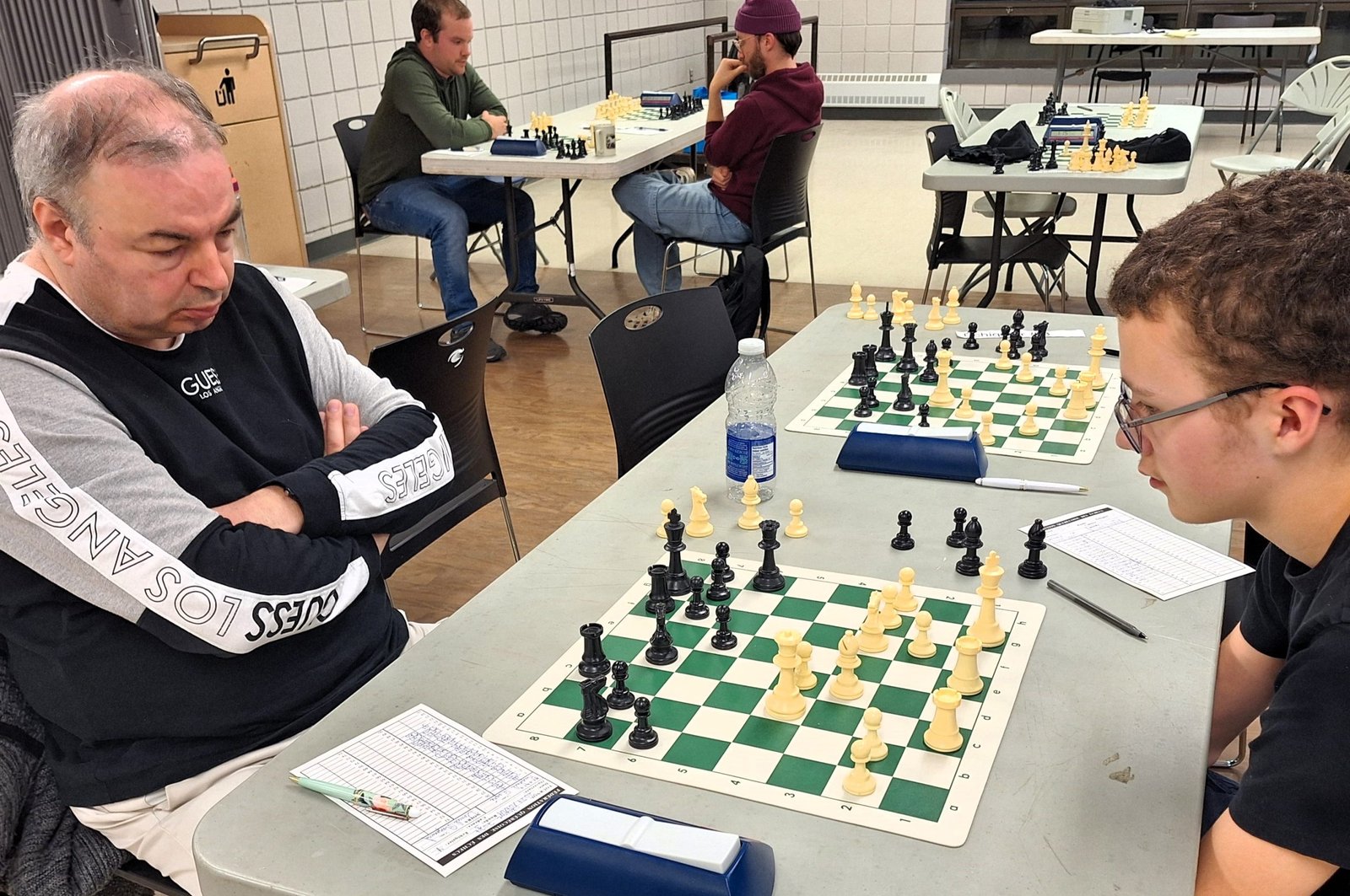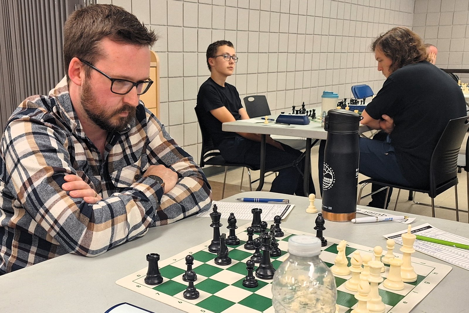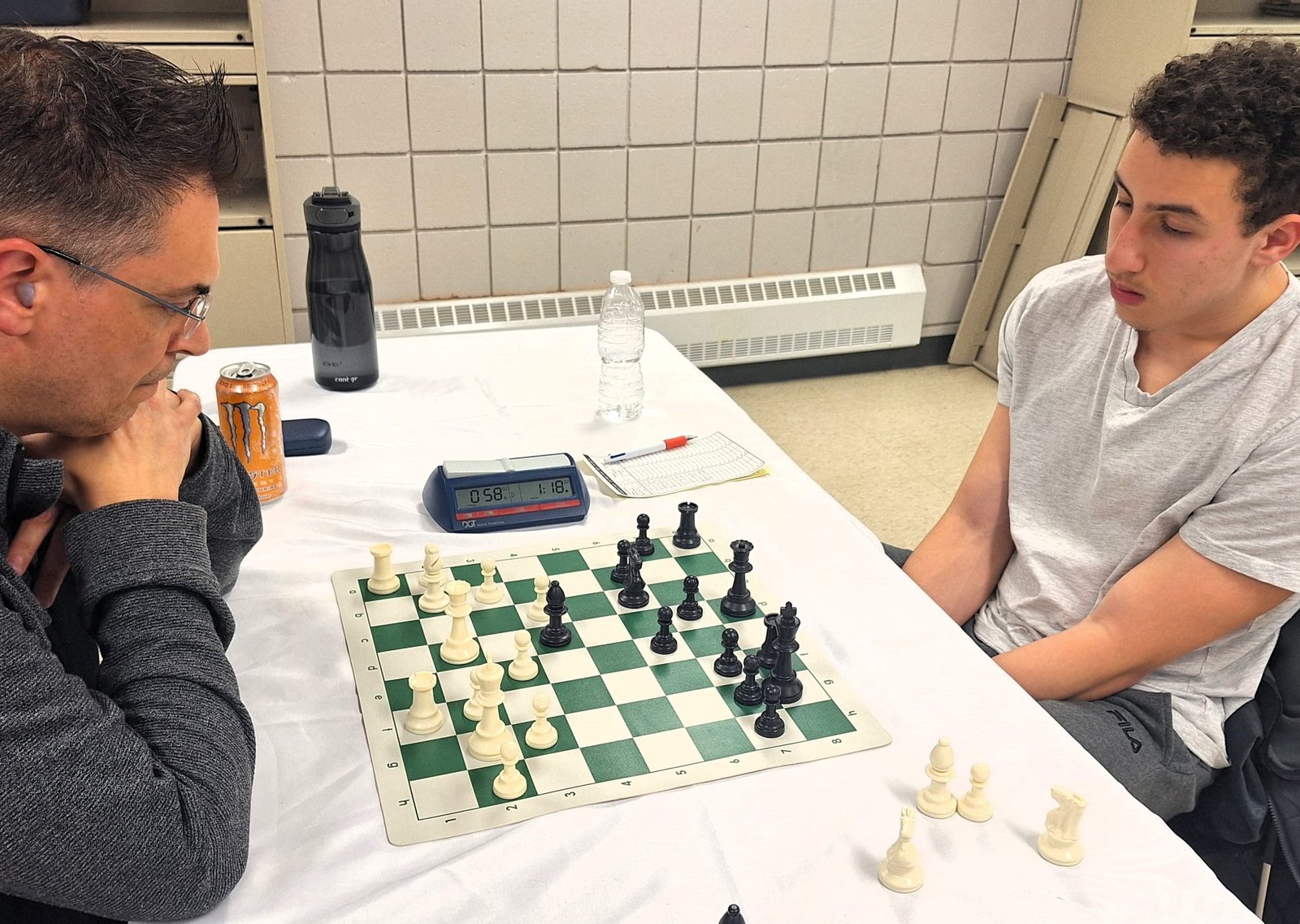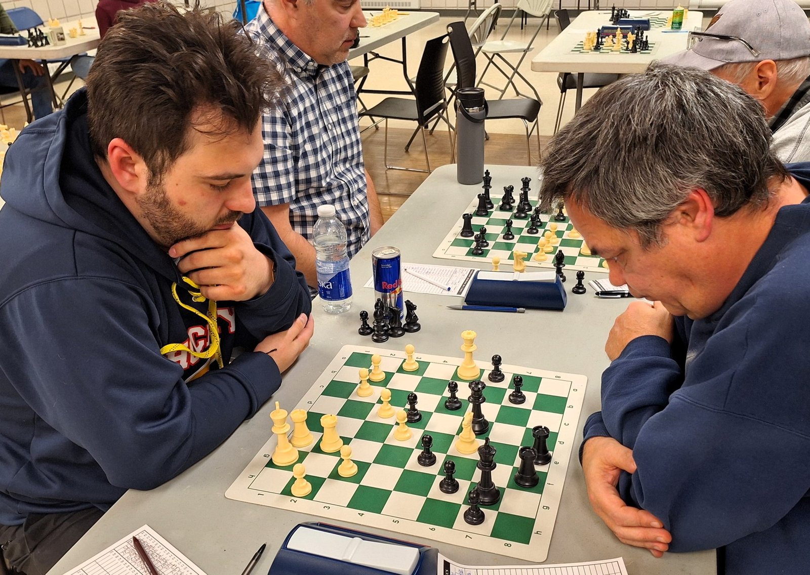 Joel Lecorre vs André Bastien : Quel duel que se sont livrés André et Joel! Pendant un long moment dans la partie, Joel a mis de la pression sur le roque de son adversaire. Il a même sacrifié une qualité pour augmenter la pression. André est un très bon défenseur et il a bien manœuvré pour solidifier sa forteresse. Il a réussi à ouvrir une colonne et il a pu obtenir du contre-jeu. J’ai remarqué qu’il y a eu plusieurs erreurs de part et d’autre en fin de partie. Clairement, la fatigue a été un enjeu et ça a plus affecté mon ami Joel. Tout de même, il faut souligner le beau retour d’André qui vengeait sa plus récente défaite.