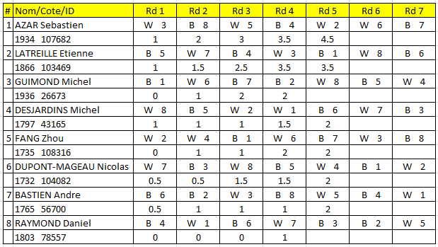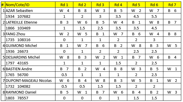 Avec une seule ronde à jouer, Sébastien est présentement très bien positionné avec 1 point d’avance sur Étienne. Mais une égalité en tête est toujours possible et, dans ce cas, un match de départage serait joué le mardi 21 juin. Toujours dans le fermé, le jeune Zhou Fang a battu Michel Guimond et se place au 3ème rang avec 3 points.