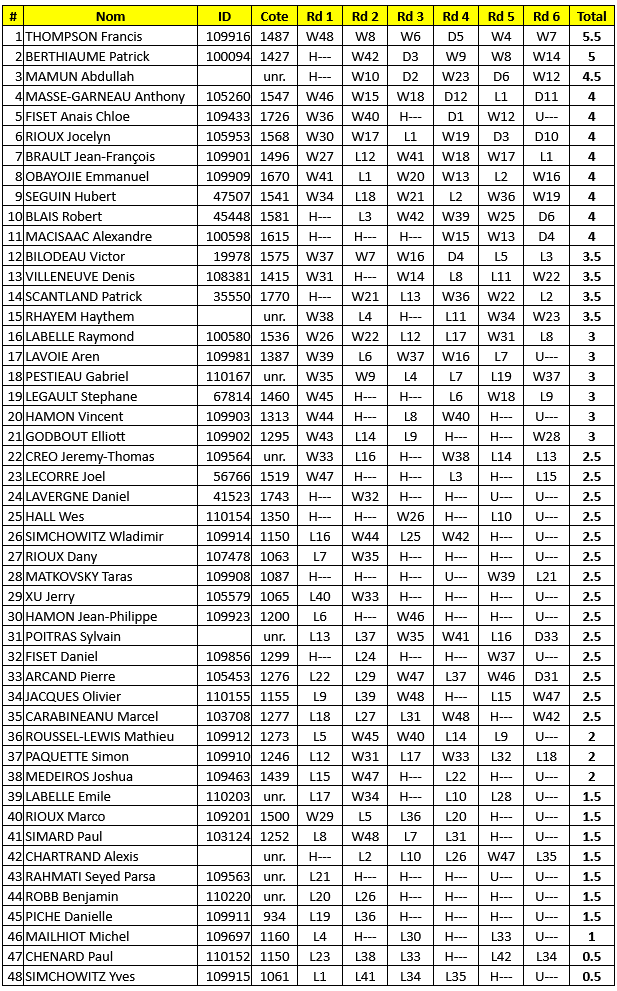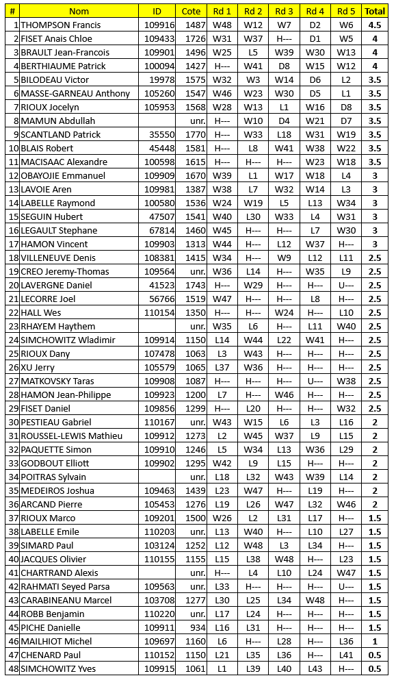 Dans la Section Réserve, Francis Thompson, une recrue parmi une multitude de pépites dont nous sommes très fiers, s’est particulièrement distingué mardi dernier en battant le jeune « vétéran » Anthony Massé-Garneau qui l’an passé a joué dans le Fermé. Grâce à cet exploit, Francis se détache du peloton avec 4,5 devant Anaïs Fiset, Jean-François Brault et Patrick Berthiaume qui ont aussi gagné leur partie et qui ne suivent pas loin avec 4 pts.