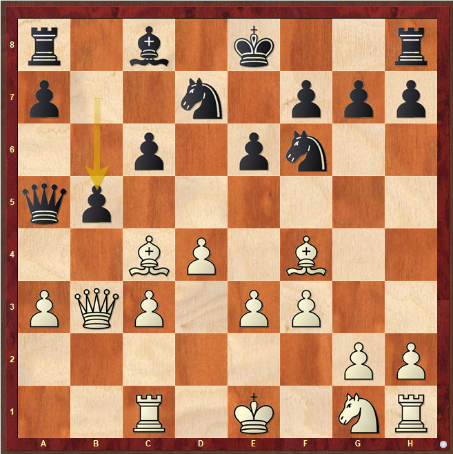 12. Nd5 est le coup qui donne l’avantage aux Blancs – une attaque double sur la Dame et le pion e7. 12…Dd8 n’est pas possible à cause de 13.c7 qui gagne une pièce. À noter que si le Roi blanc était en c1, Cd5 ne fonctionnerait pas à cause de Da5xDd2 avec échec au Roi, d’où l’importance du coup 9.Rb1 qui a été joué plus tôt. Fabien a commenté toute cette partie que vous pouvez aller rejouer en allant au diagramme ci-dessus (pour la trouver cliquer sur « … »).