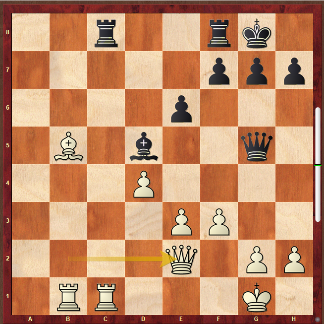 - Les Noirs ont un pion de moins mais attaquent avec Dg5, menaçant Fxf3 et Dxe3, les Blancs ont défendu avec De2 est-ce bon? 27.De2 ne fonctionne pas; les Noirs ont trouvé la faille: 27…Txc1+ 28.Txc1 Fxf3 29.Dxf3 Dxb5. Le meilleur coup était 27.e4 qui est la parade aux deux menaces des Noirs.