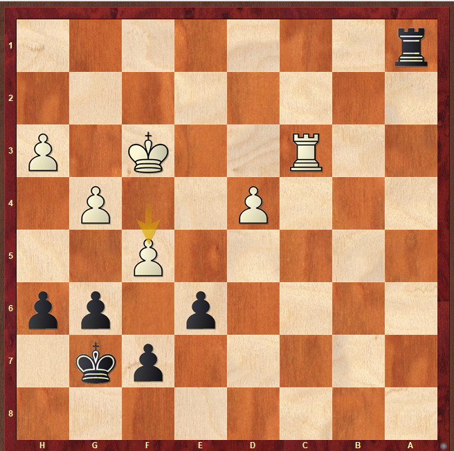 - Avec quel pion prendre, e6xf5 ou g6xf5 et pourquoi? Puisque les blancs vont perdre un pion en f5 a cause de Tf1+ suivi de Txf5, la seule façon dont les Blancs auront du contre jeu sera d’avoir un pion passé en d4 qui, assisté du Roi, menacera de faire Dame, donc il faut prendre avec le pion en g6 et laisser le pion e6 en place pour arrêter le pion d4. 40…gxf5 41.gxf5 Tf1+ 42.Re4 Txf5 est gagnant (40…exf5 41.gxf5 Tf1+ 42.Re4 Txf5 43.d5 pion passé).