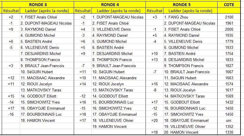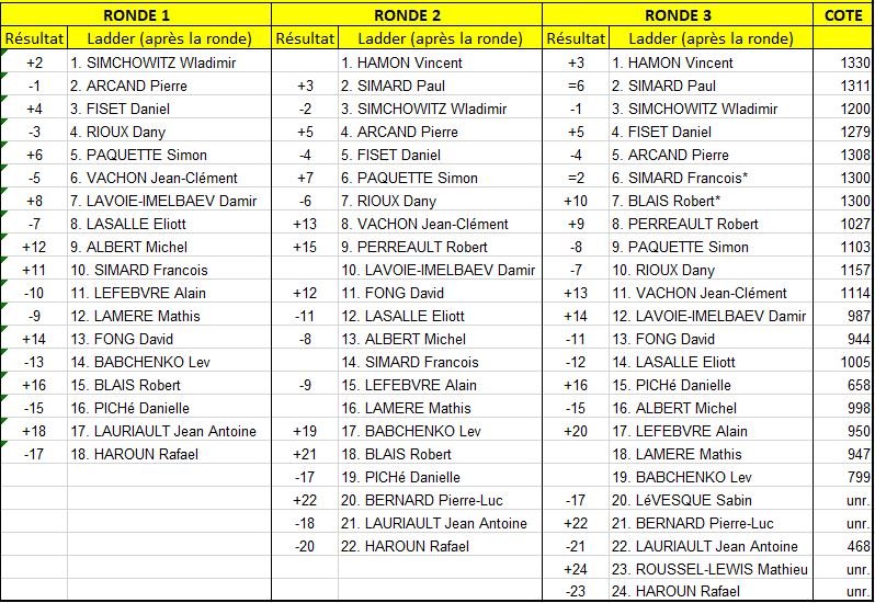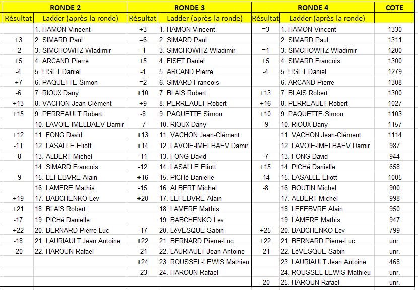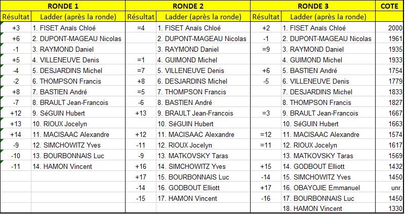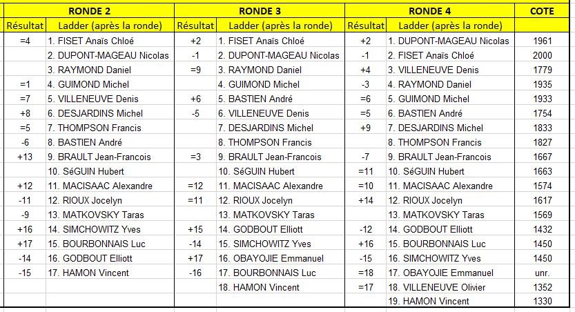 Pour ce premier tournoi, dans la section Ouverte, Alexandre MacIsaac a cumulé 4 points devant André Bastien avec respectivement 3,5 et 3 points. Dans la section Moins de 1400, Robert Blais a fini avec une fiche vierge de 5 points, suivi d’une triple égalité au 2ème rang avec 3,5 points comprenant Robert Perreault, Pierre-Luc Bernard et François Simard.
