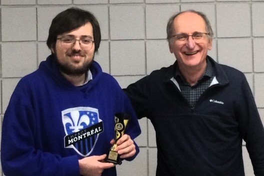 Après une dure défaite contre Sam Marin d’Ottawa, par la suite il a aligné 3 gains consécutifs pour terminer seul en tête. Dans la photo ci-dessus, il accepte le trophée que lui remet Hubert Séguin, président de la LÉO. Voir les résultats détaillés plus bas.