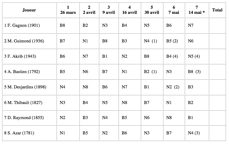 | 7 | DESROSIERS Alain | unr. | WW12 | LL2 | WL16 | W=14 | WL8 | WW11 | WL6 | 8.5 | |