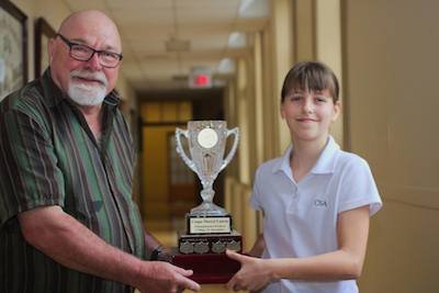 Marcel Laurin remettant la coupe portant son nom à Otilia Leva (photo : Marc Courtemanche via Facebook)