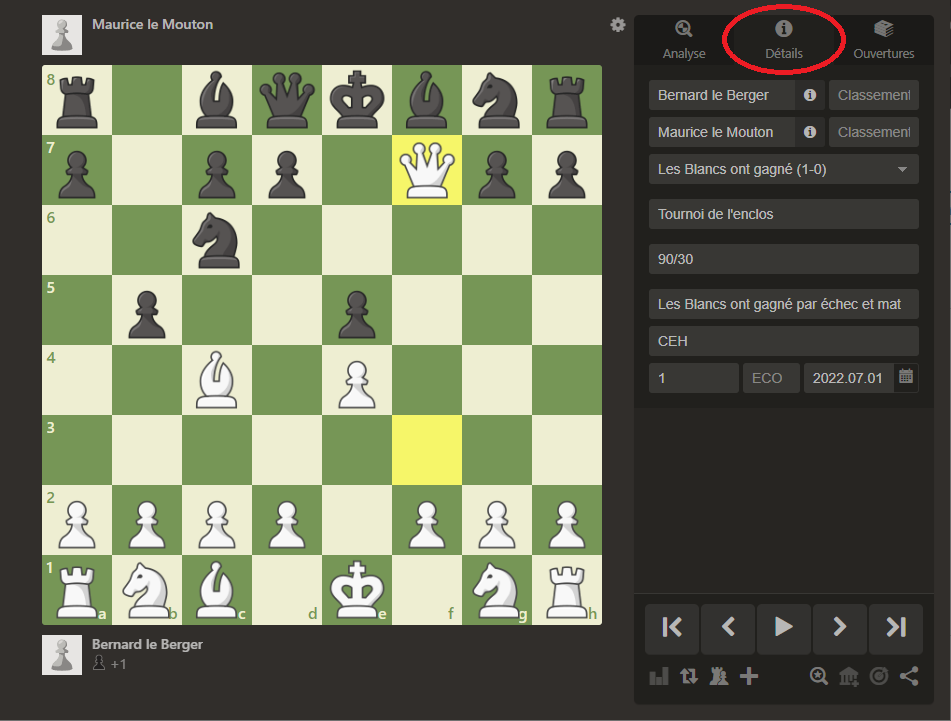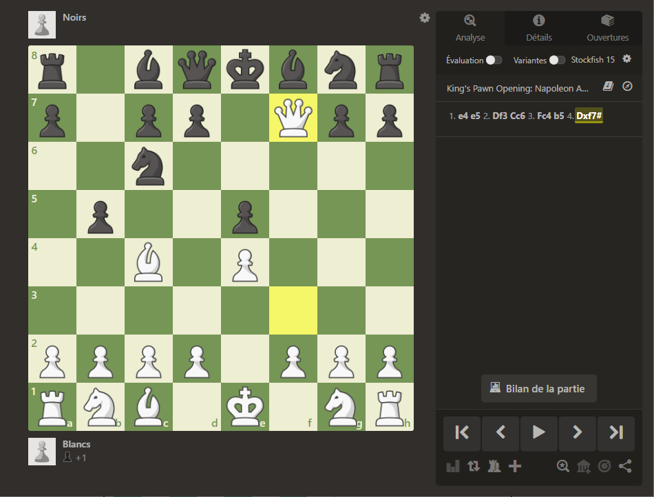 Voici un exemple de transcription de partie en format PGN pour le mat du berger.