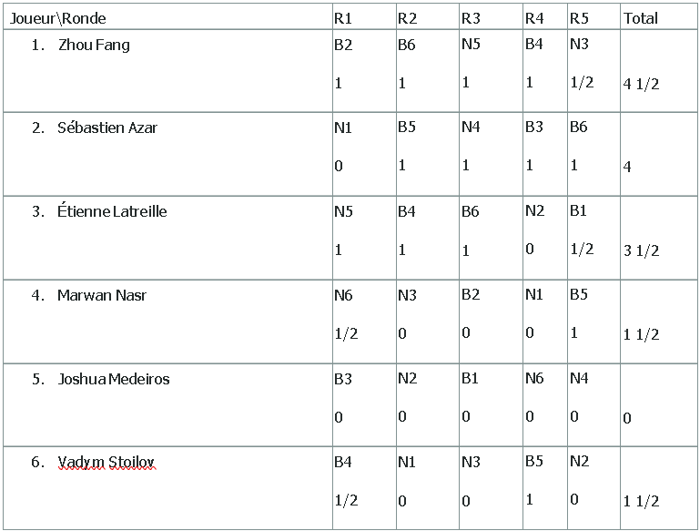 C’était le samedi 21 août et le dimanche 22 août que 6 jeunes excellents joueurs de l’Outaouais se disputaient le titre de champion junior pour l’année 2021. Avec la pandémie, la situation échiquéenne fut très différente de ce à quoi les amateurs du jeu des rois sont habitués. Cette année, les joueurs pouvaient donc se qualifier par leur cote chess.com dans le but de donner une chance à tous de jouer. Les 6 joueurs qualifiés étaient donc le champion junior défendant, Étienne Latreille, le champion de l’Outaouais 2020, Sébastien Azar, Zhou Fang, Joshua Medeiros, Vadym Stoilov et Marwan Nasr. Après deux jours de parties difficiles, c’est Zhou Fang, le plus jeune participant du championnat, qui remporte les grands honneurs. Toutes nos félicitations à ce jeune champion!