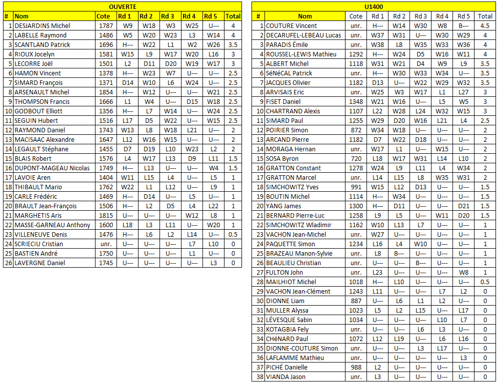 Pour la dernière partie de ce tournoi de 5 rondes, notons l’excellente performance de Raymond Labelle dans la section ouverte qui a terminé avec 4 gains. Quant à lui, Michel Desjardins qui a pris une pause, a terminé avec une fiche parfaite de 4/4.